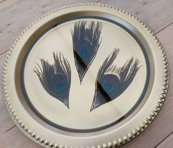 Dit prachtige dienblad werd ingegoten met 3 pauwenveren.