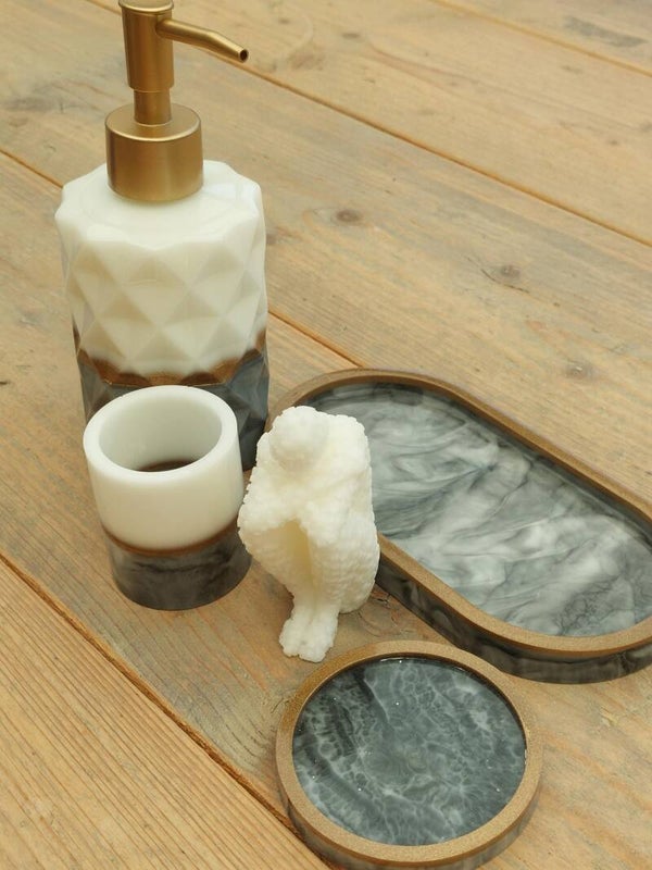 Deze leuke set bestaat uit een zeeppompje, een schaaltje, een rond schaaltje/onderzetter, een potje en een heel leuk beeldje.