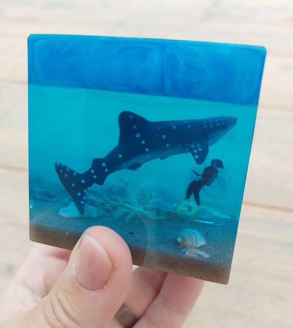 Deze kubus is 6x6x6cm en bevat een stukje oceaan met duiker en walvishaai.
