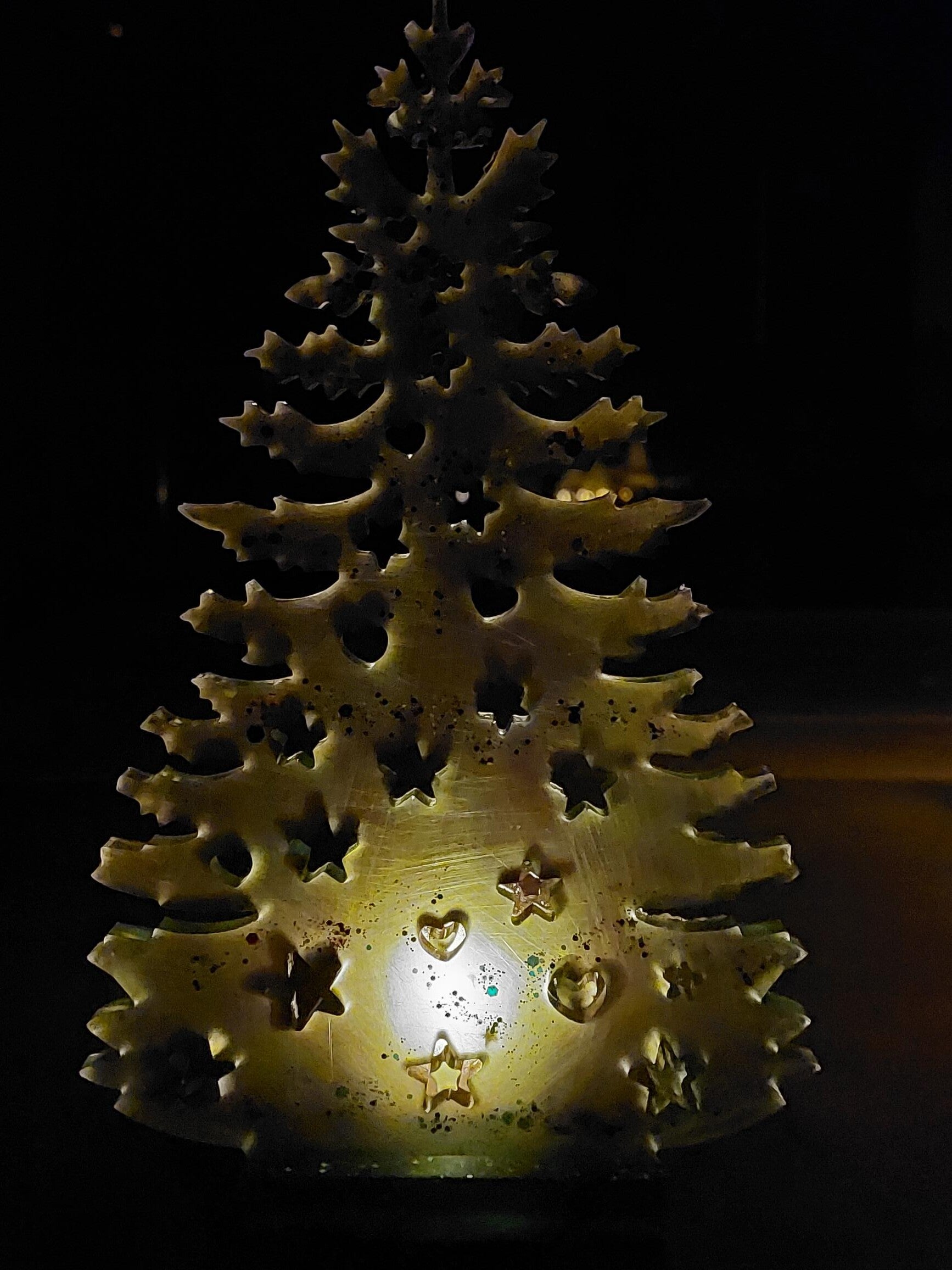 Deze leuke winter- of kerstdecoratie bestaat uit een houder met een ledkaarsje en een dennenboom die in de houder past. Het geheel is 22,5cm hoog.