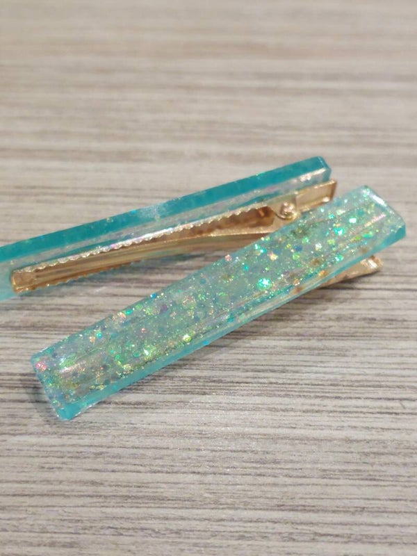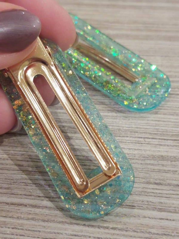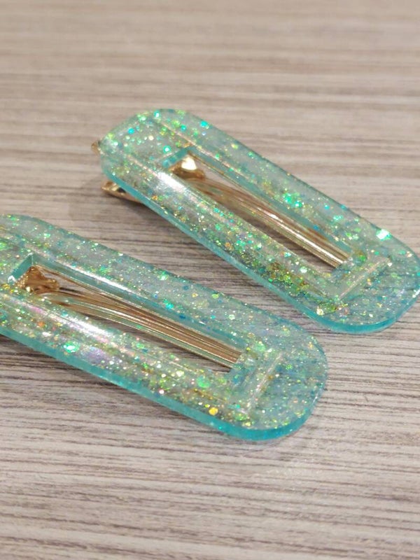 In turquoise met glitters, in verschillende modelletjes verkrijgbaar.