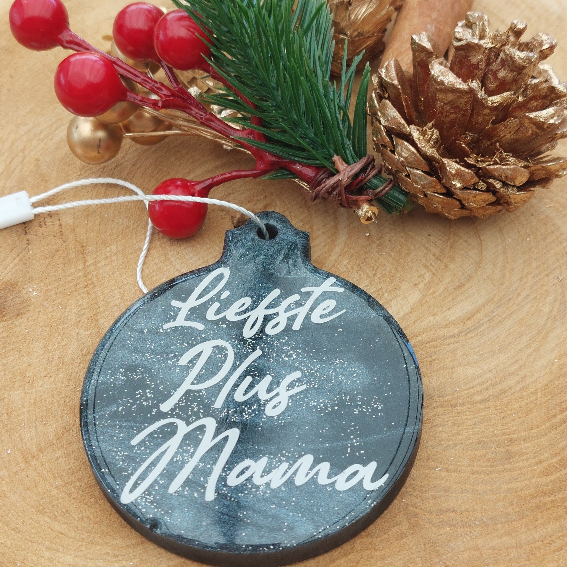 Handgemaakte, volledig in resin gegoten kersthanger met luxe glans en diepte.Stevig, glanzend en speciaal voor de liefste plusmama – een uniek kerstcadeau vol warmte.