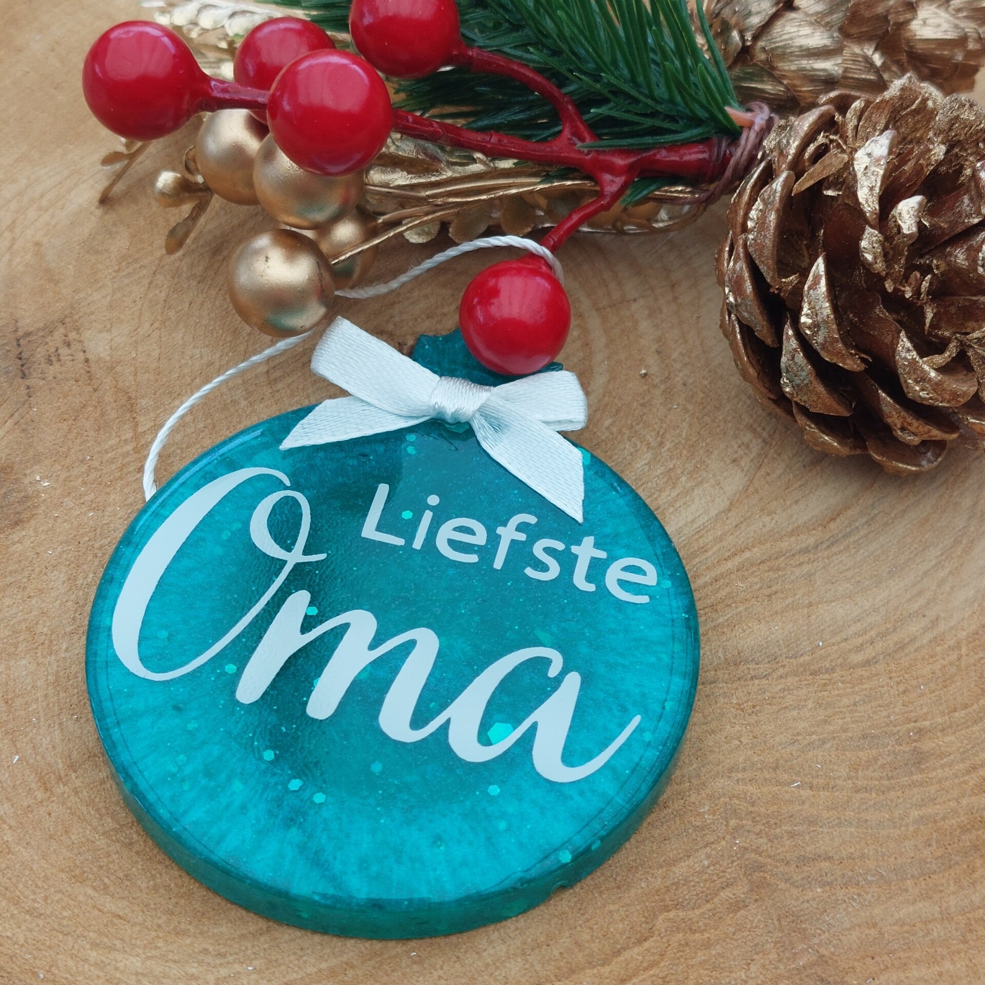 Handgemaakte, volledig in resin gegoten kersthanger met luxe glans en diepte.