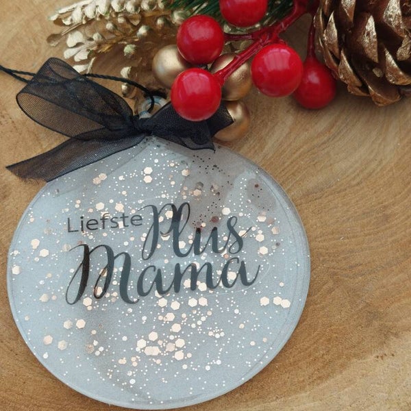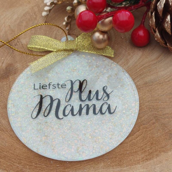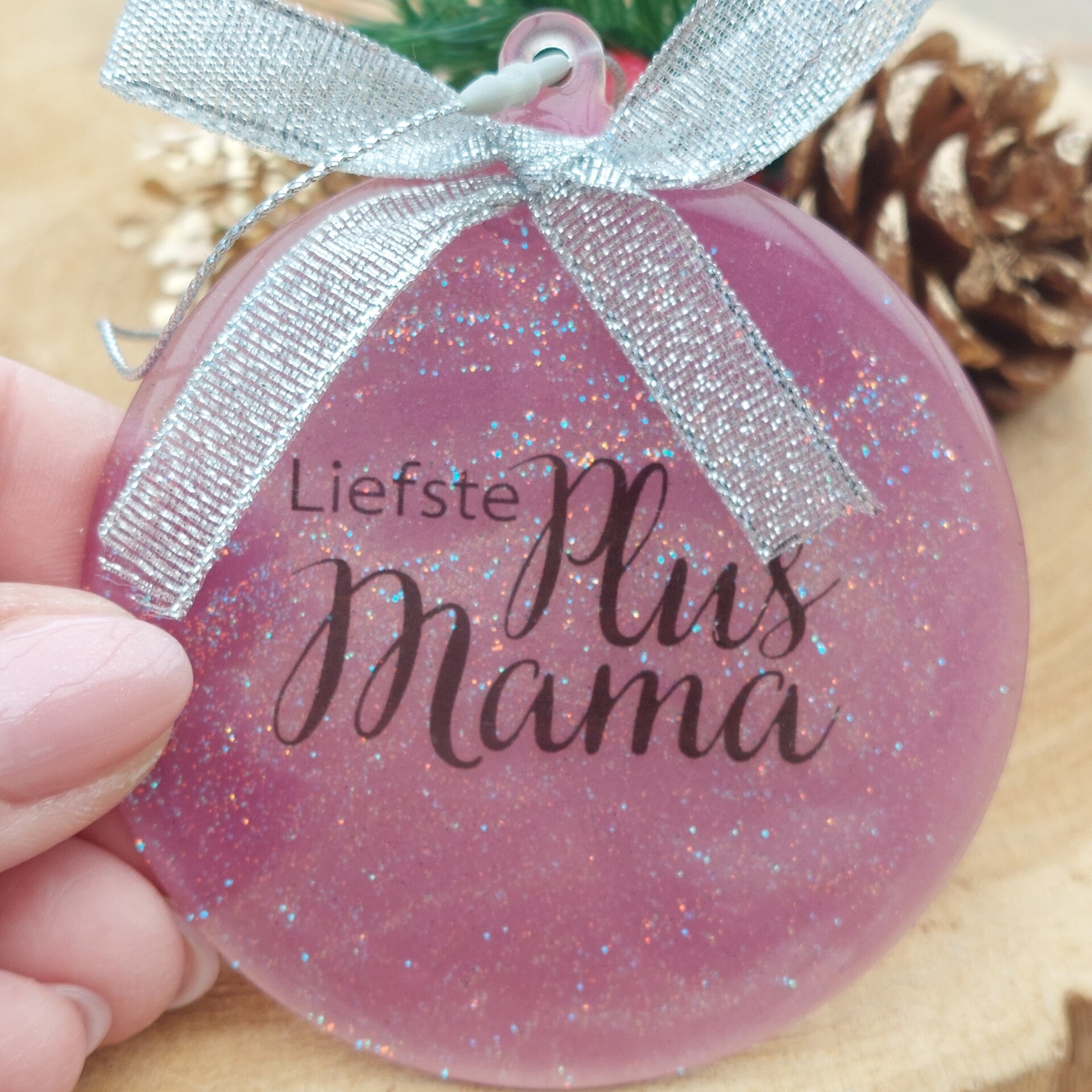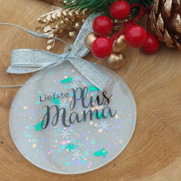 Elegante, lichte kersthanger met acrylbasis en twee lagen resin voor extra glans.Fijn, feestelijk en speciaal voor de liefste plusmama – een subtiel juweeltje voor in de kerstboom.