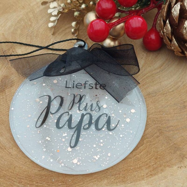 Elegante, lichte kersthanger met acrylbasis en twee lagen resin voor extra glans.Fijn, feestelijk en speciaal voor de liefste pluspapa – een subtiel juweeltje voor in de kerstboom.