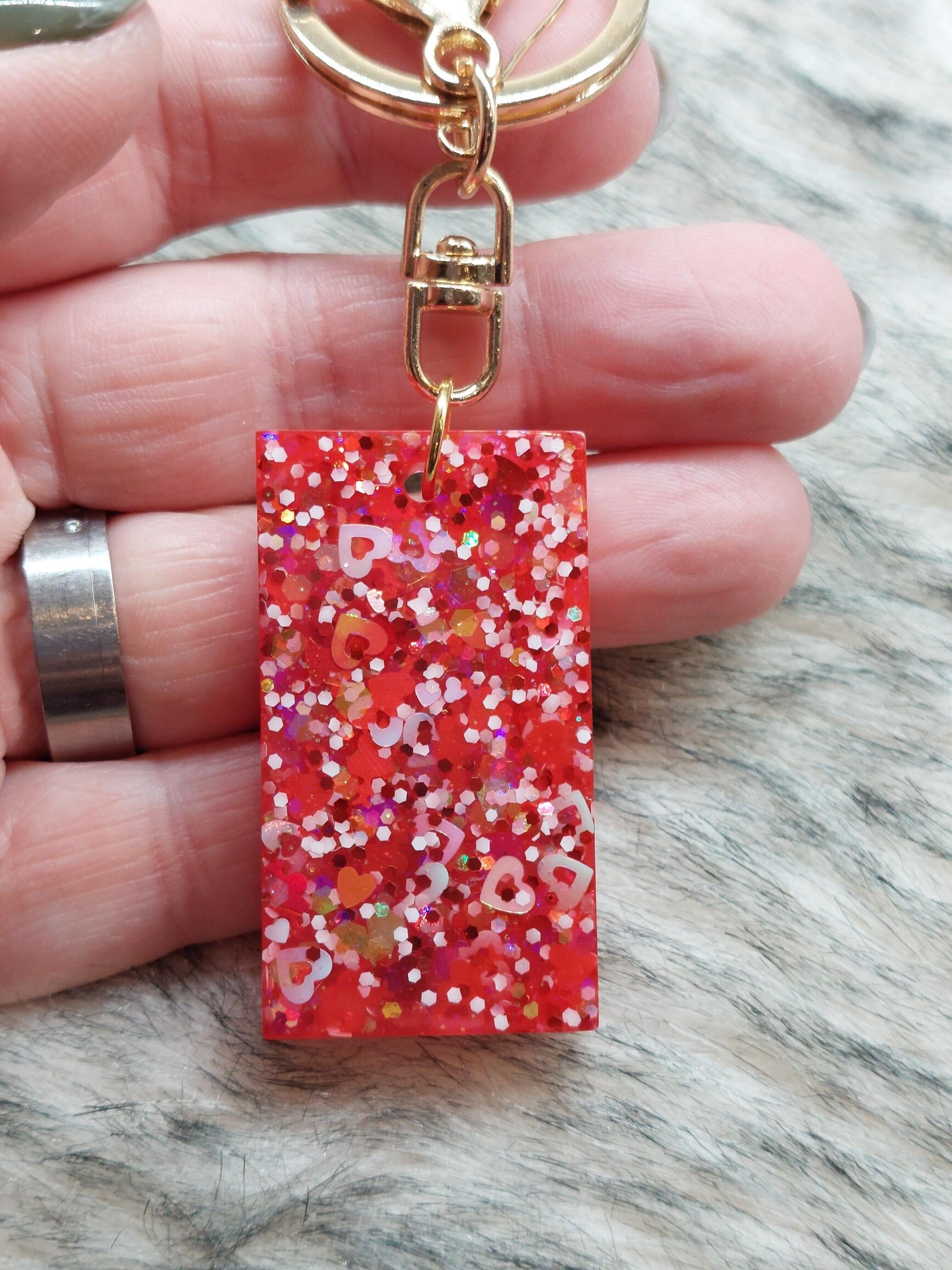 In romantisch rood, met Valentijdsglitter aan de andere kant en tekst in gouden letters. Goudkleurige sleutelring.