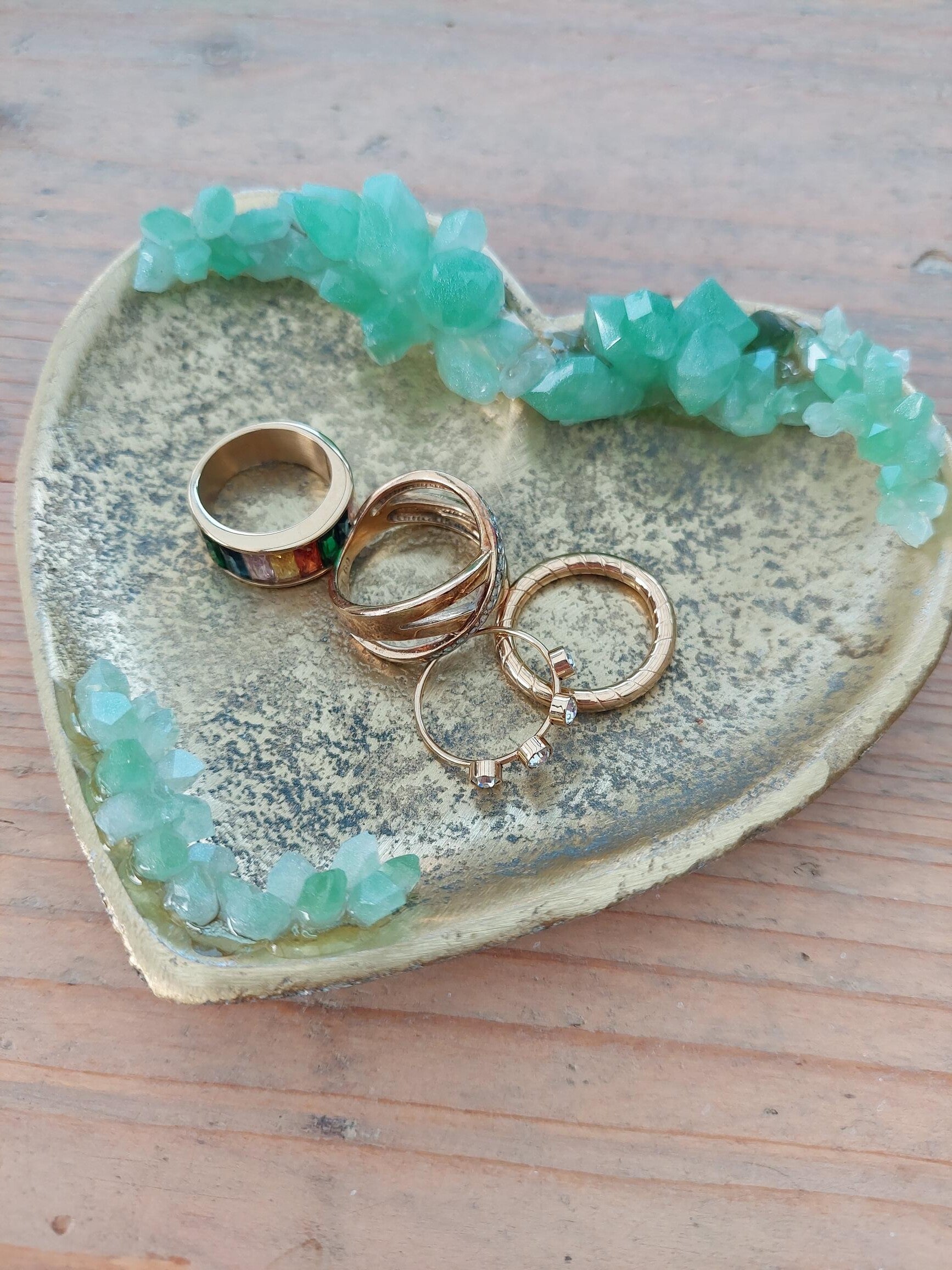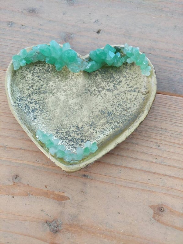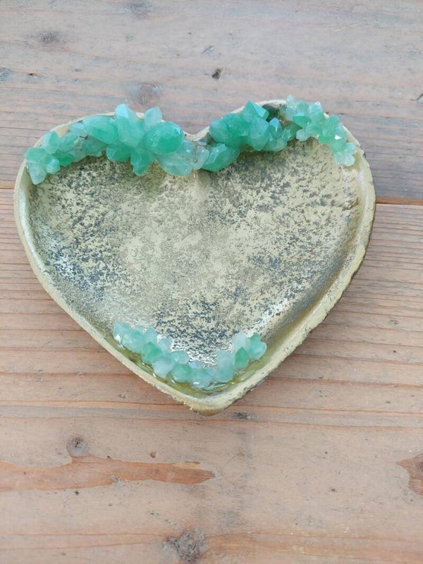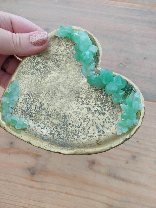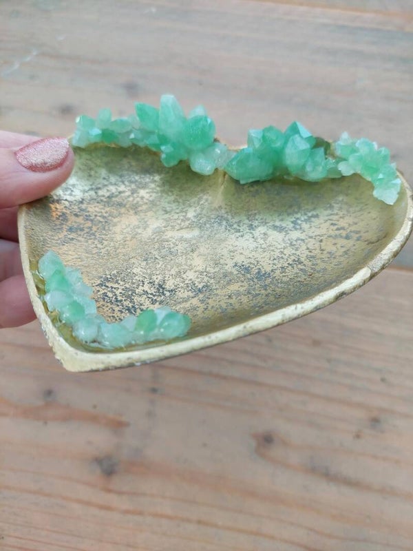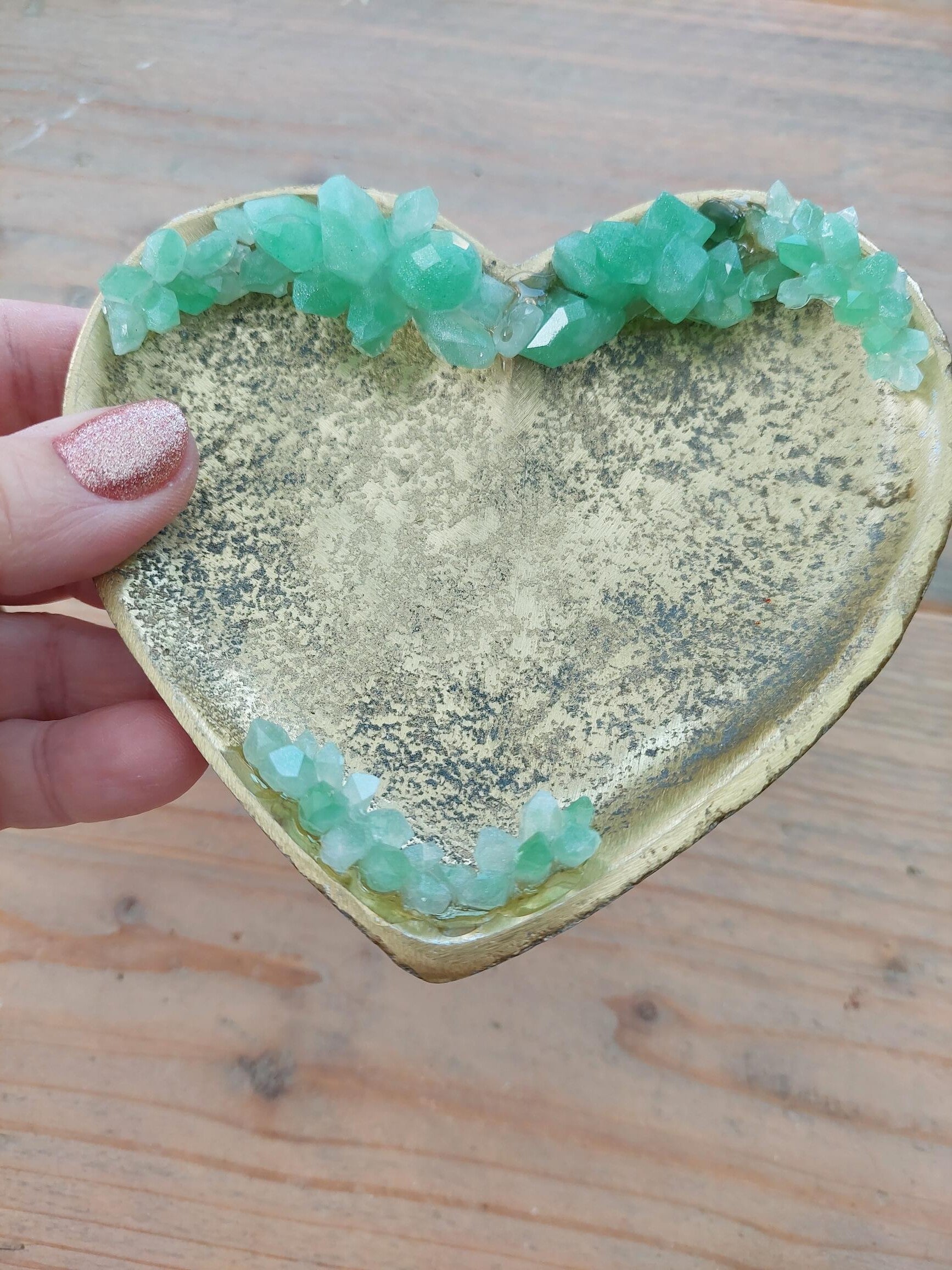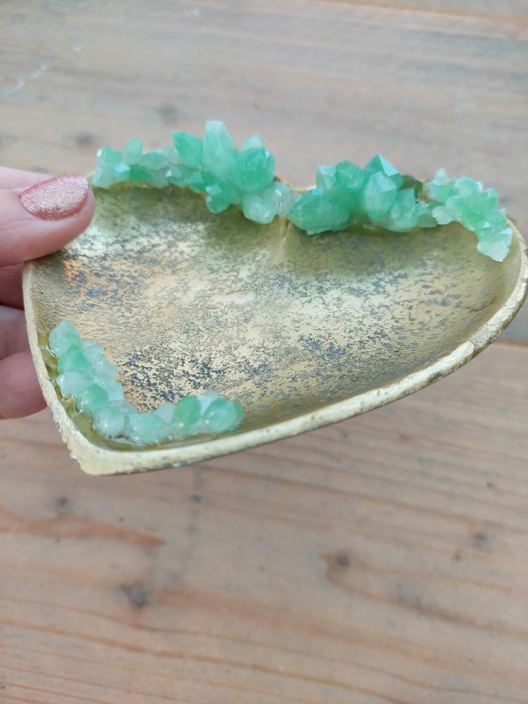 Schattig goudkleurig schaaltje, versierd met decoratieve groen gekleurde kristallen uit giethars.