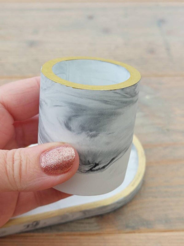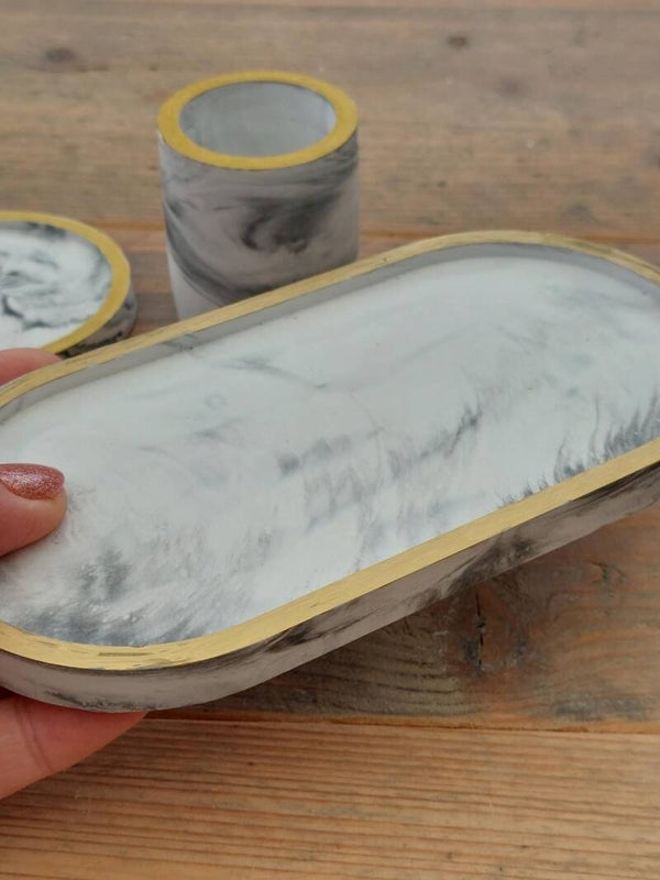 Mooie set in porseleingips met een prachtige gemarmerde kleurencombinatie en goudkleurige randjes.