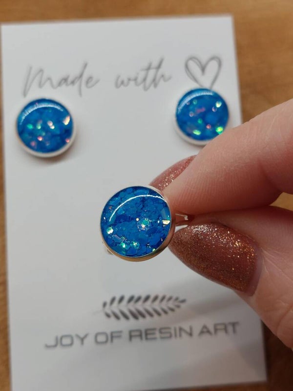 Prachtige oorstekers met zilverkleurige setting en blauwe glitter Pearly Blue en een bijpassende verstelbare ring.